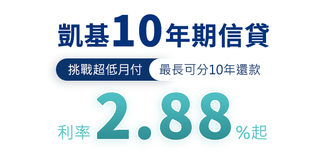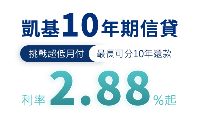 - 各信用貸款專案內容及條件均不同,詳細內容依凱基銀行最新規定為準,相關內容及限制條件請洽本行官網,本行保留核貸與否、詮釋、裁決及終止權利。