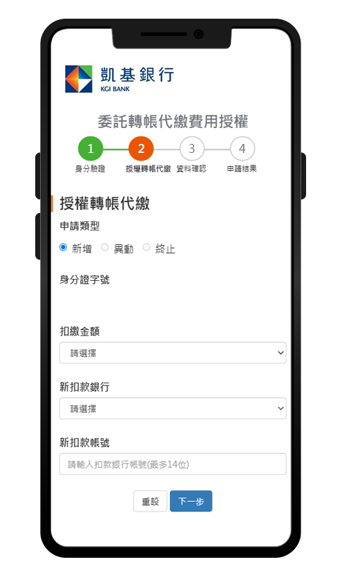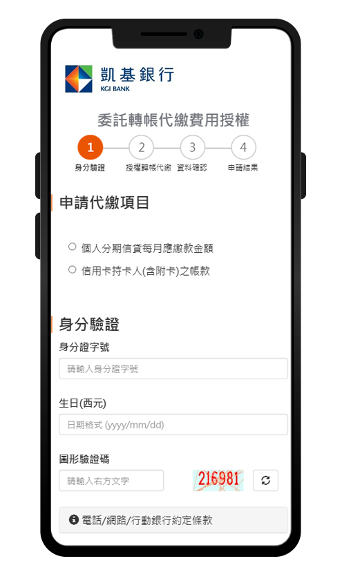 - 電話專人服務:若扣繳銀行為凱基銀行,可致電客服專線:(02)8023-9088由專員為您完成申辦。